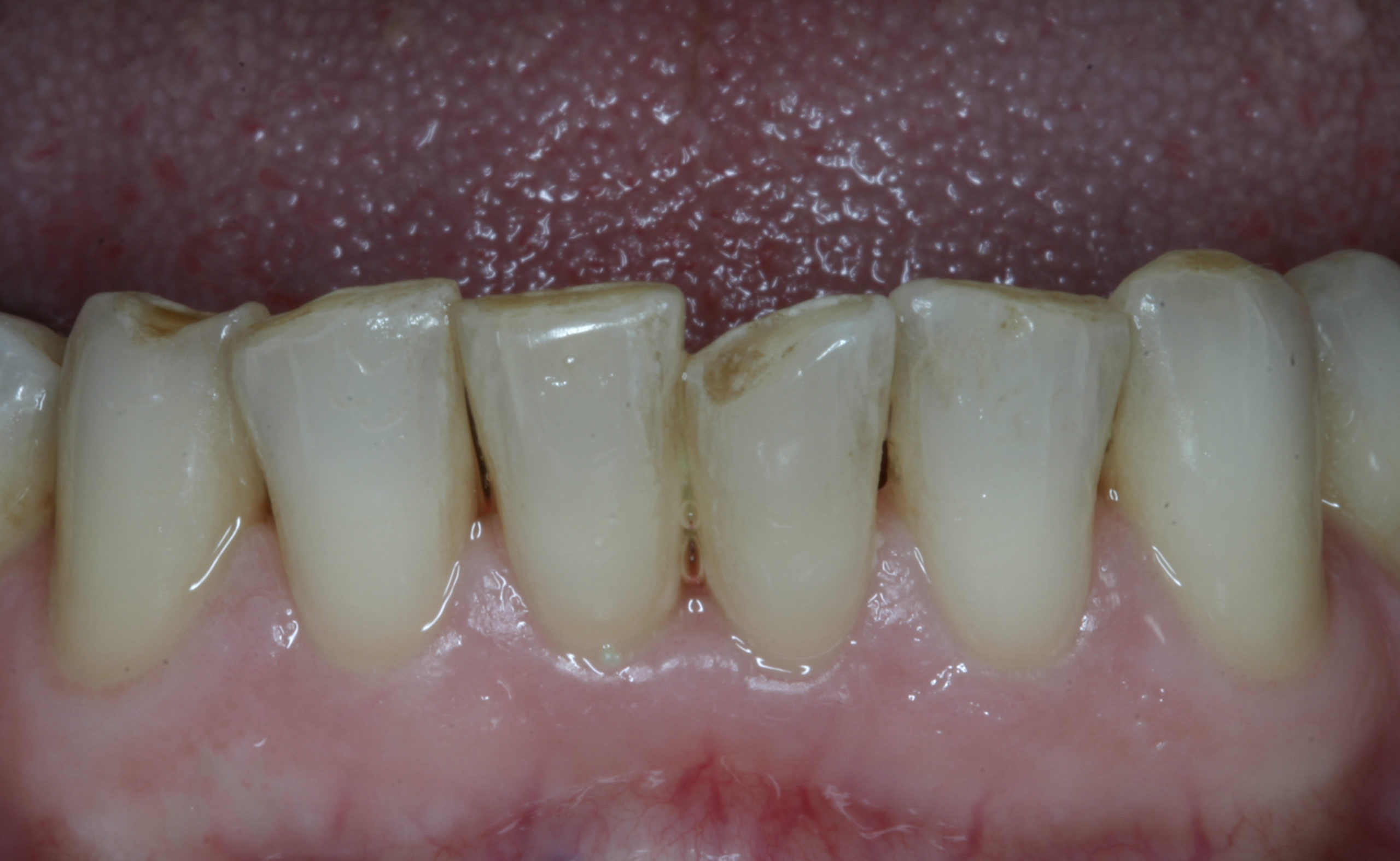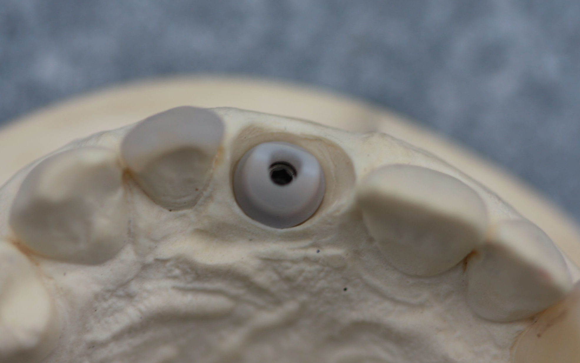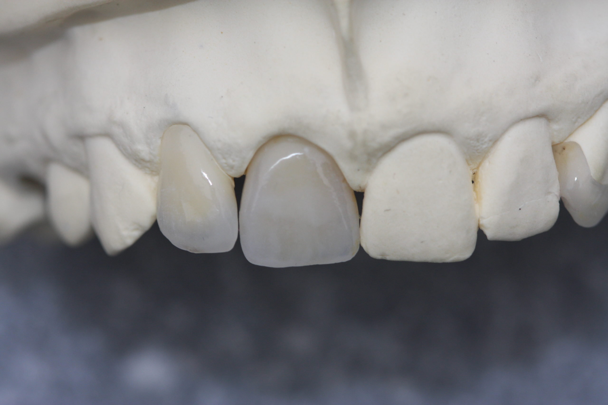 Zahnformen werden mit einem einfarbigen, einheitlichen Vollkeramikrohling erzeugt und durch aufgemalte Farben den natürlichen Zähnen angepasst