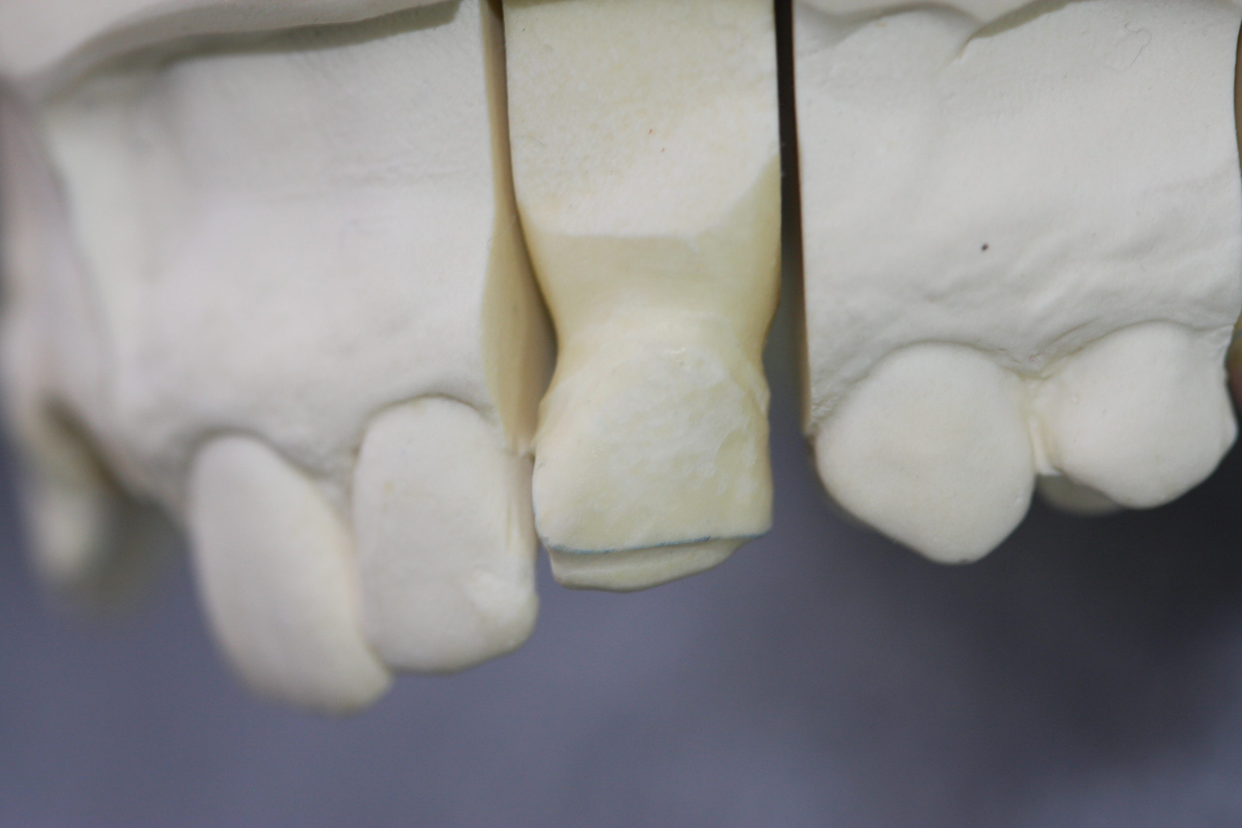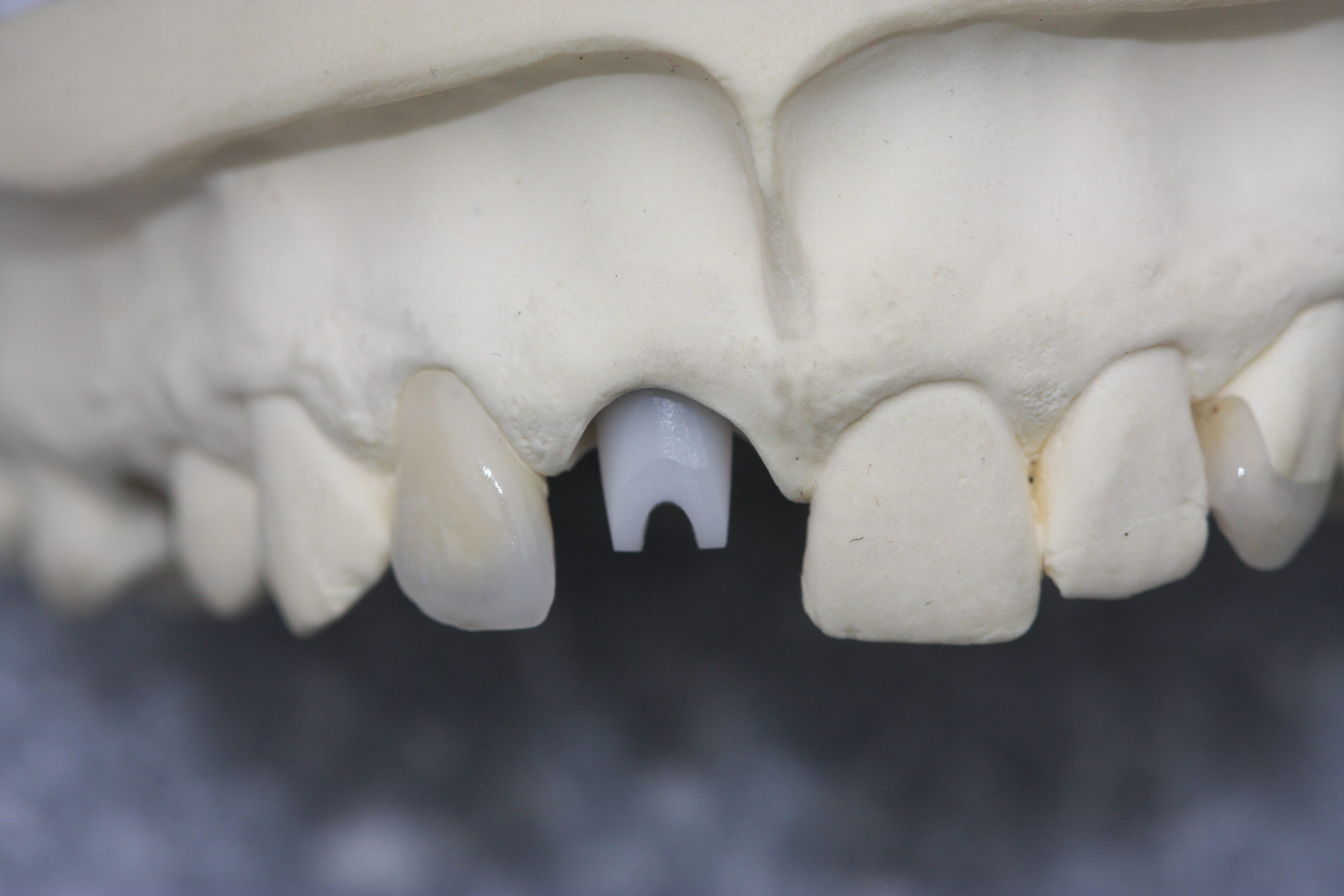 Herstellung einer reduzierten Zahnform aus einem Vollkeramikrohling. Bei Brücken wird die volle Zahnform mit individuellen Keramikmassen ergänzt (Press-Schichttechnik). Diese Technik ist nur für „kurzspannige“ Brücken geeignet