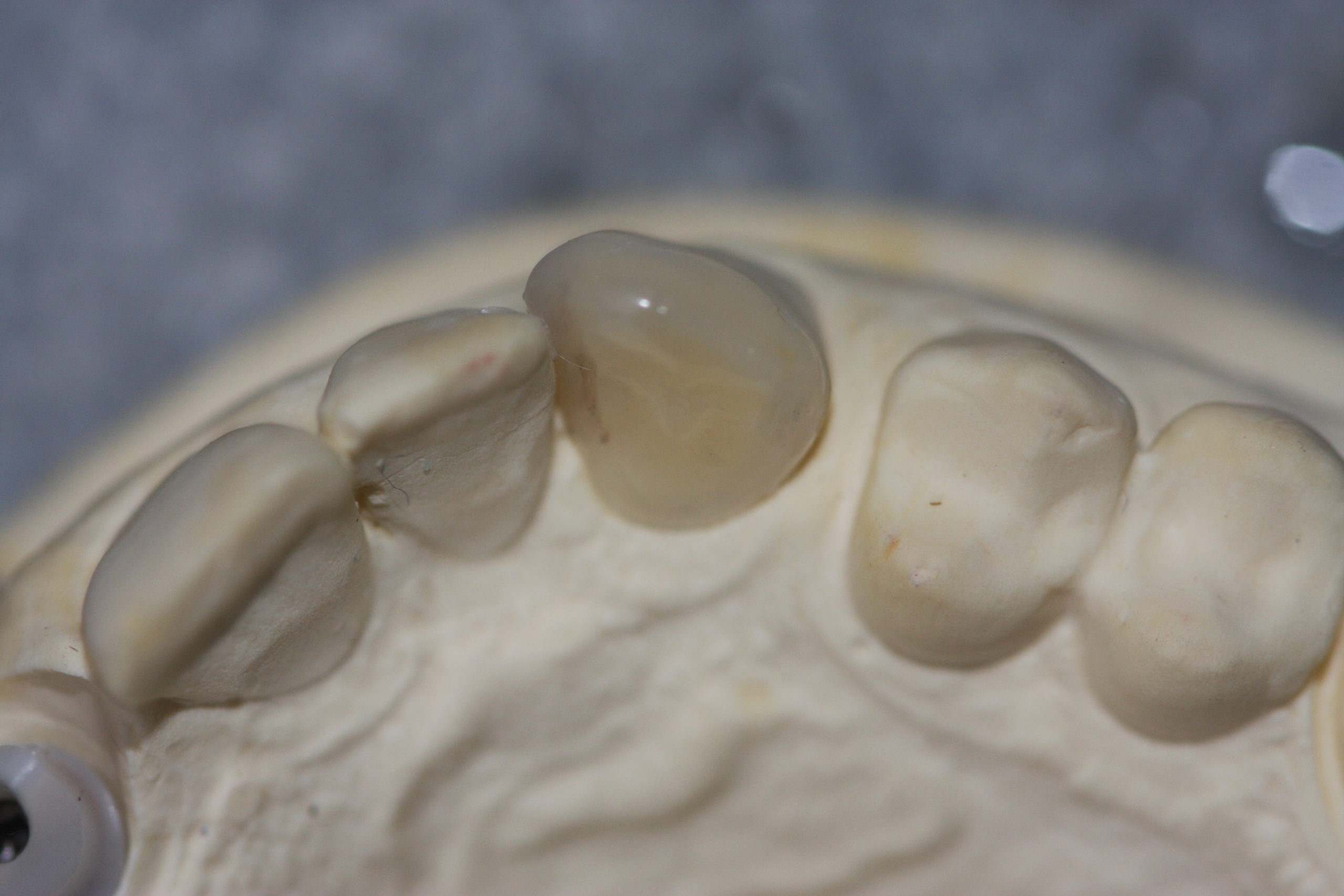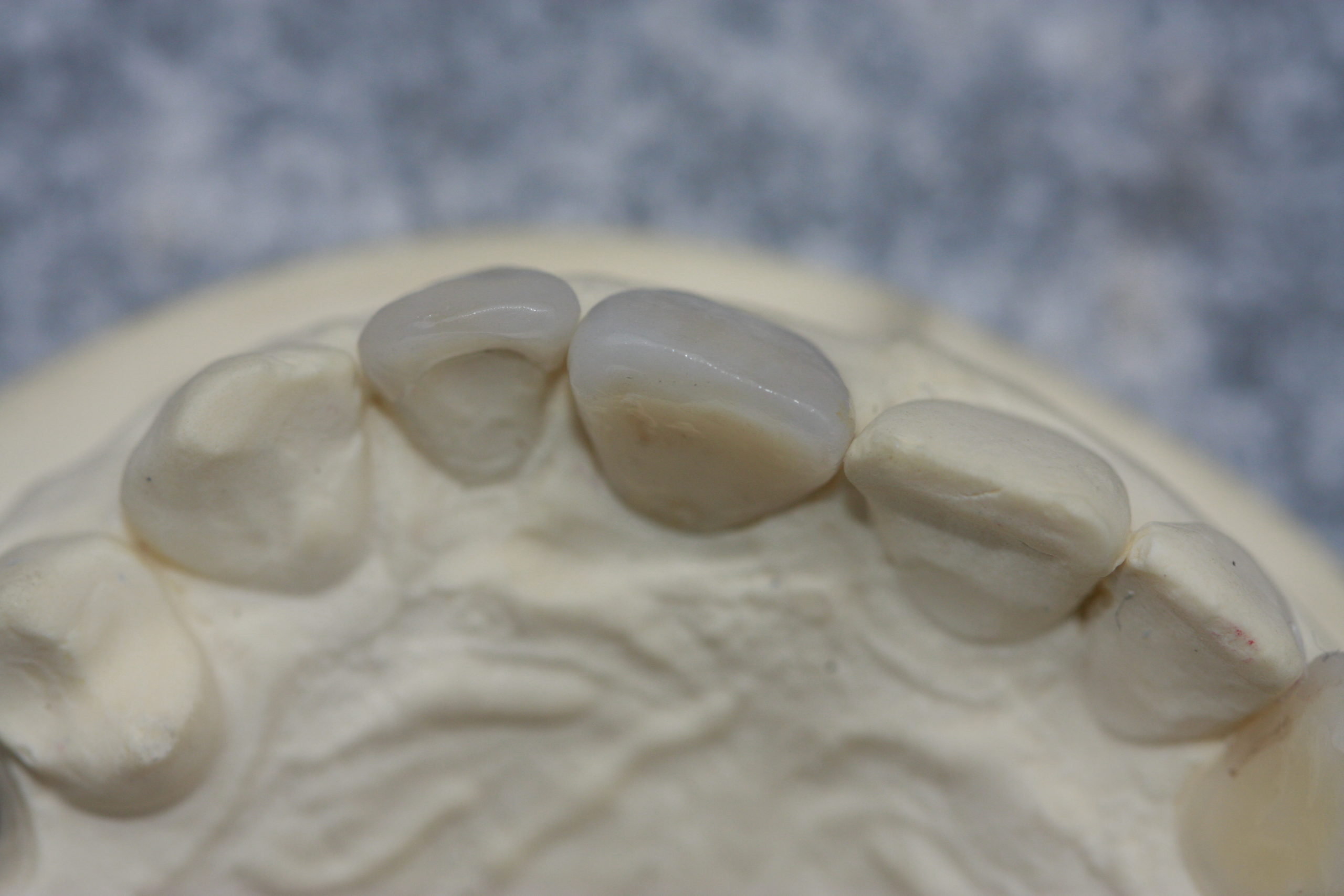 Herstellung einer reduzierten Zahnform aus Zirkon. Bei Brücken wird die volle Zahnform mit individuellen Keramikmassen ergänzt