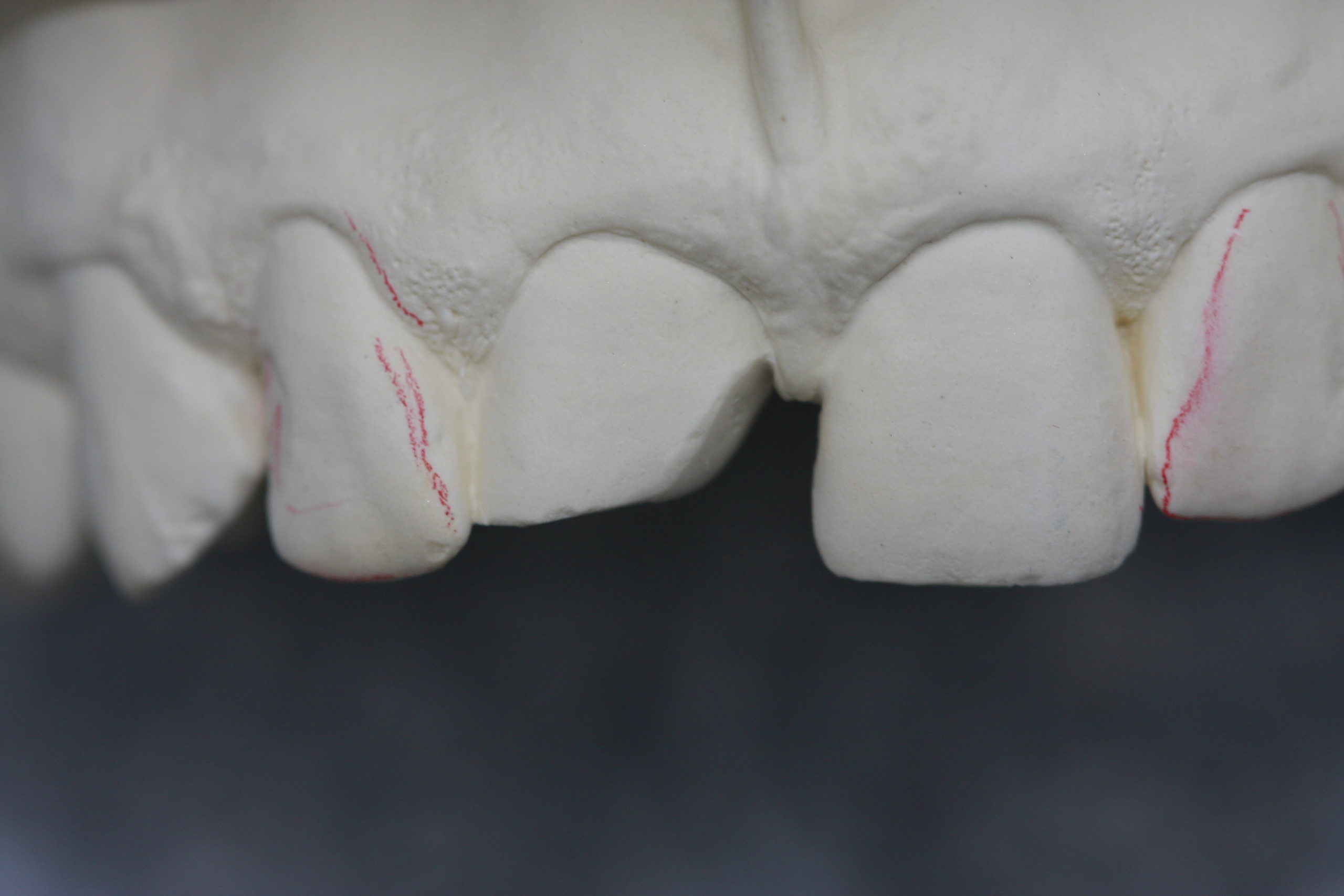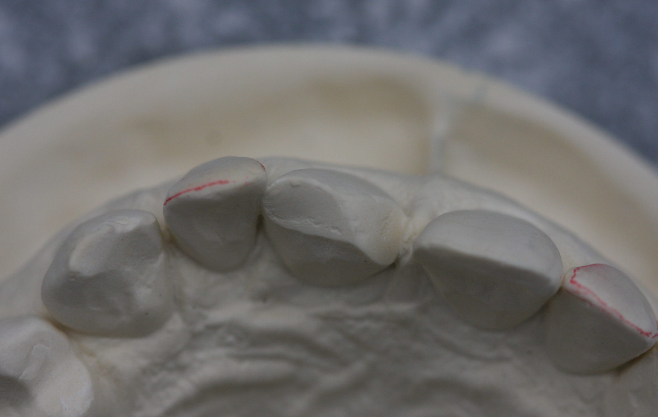 Reduzierte Zahnformen werden wie genannt erzeugt und mit Hand aufgetragenen, farblich individuellen Keramikmassen ergänzt (3D Effekt)